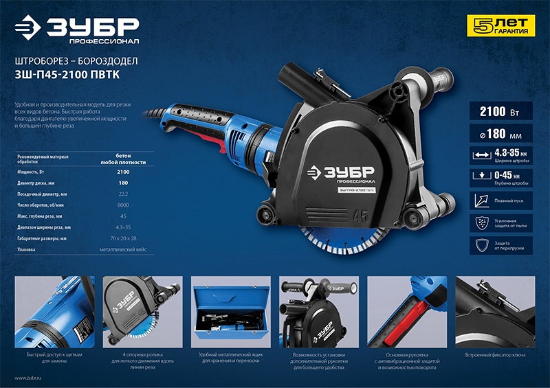 Преимущества штробореза Зубр Профессионал ЗШ-П45-2100 ПВТК: